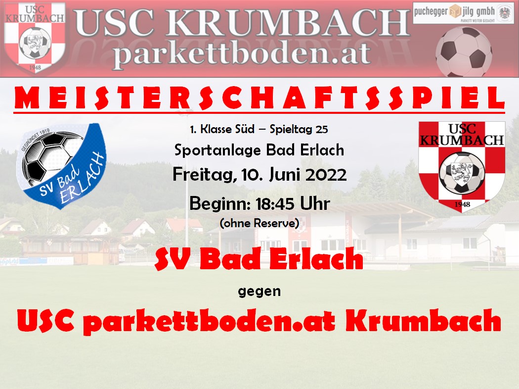 Gespielt wird am Freitag den 10. Juni um 18:45 Uhr ohne Reserve auf der Sportanlage in Bad Erlach.